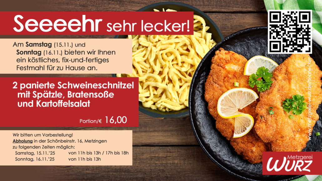 Zudem bitte:2 Rinderrouladen mit Bratensoße Kartoffelknödel und Rotkraut (22 €)2 Schweineschnitzel mit Bratensoße Spätzle und Kartoffelsalat (16 €)
